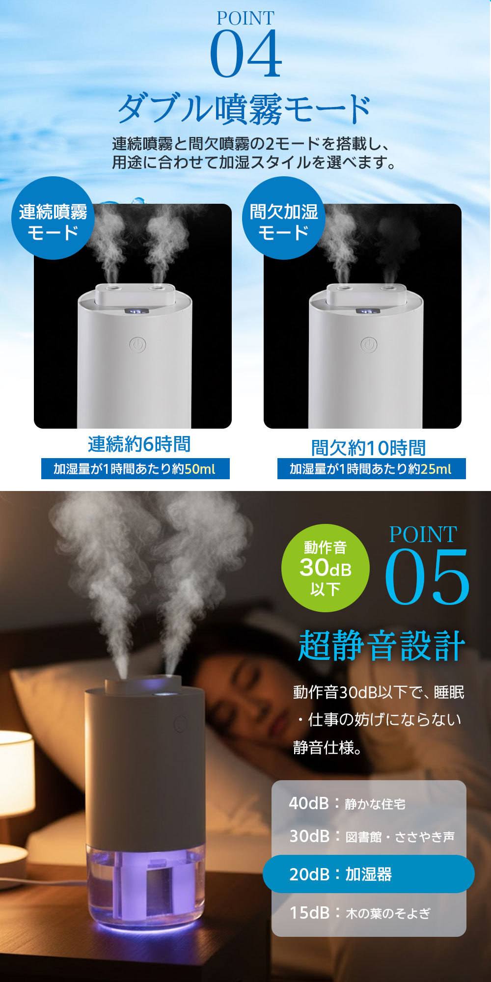「連続噴霧モード」と「間欠噴霧モード」の2種類を搭載。連続約6時間、間欠約10時間の長時間加湿で、シーンに合わせて最適な潤いを届けます。