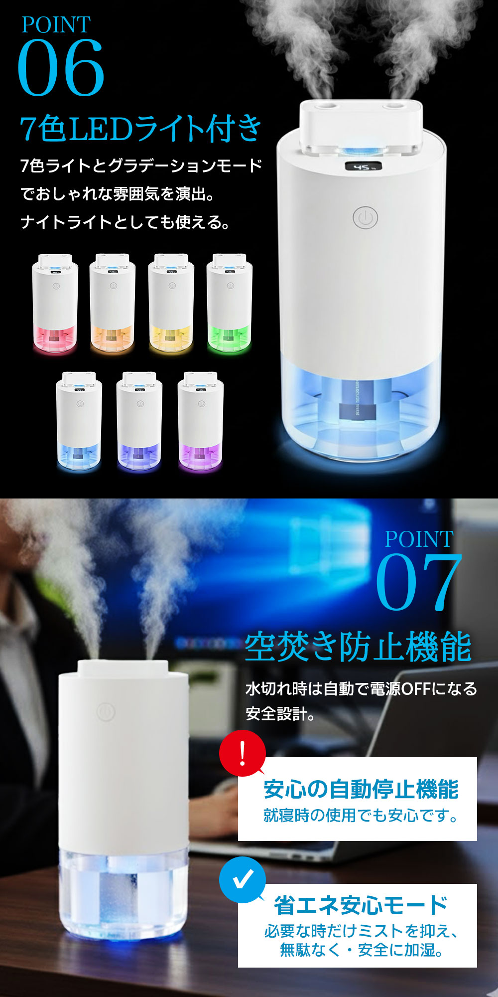 動作音は30dB以下の超静音仕様で、睡眠・育児・デスクワークを邪魔しません。7色LEDライトで雰囲気づくりも楽しめ、ナイトライトとしても使用可能。