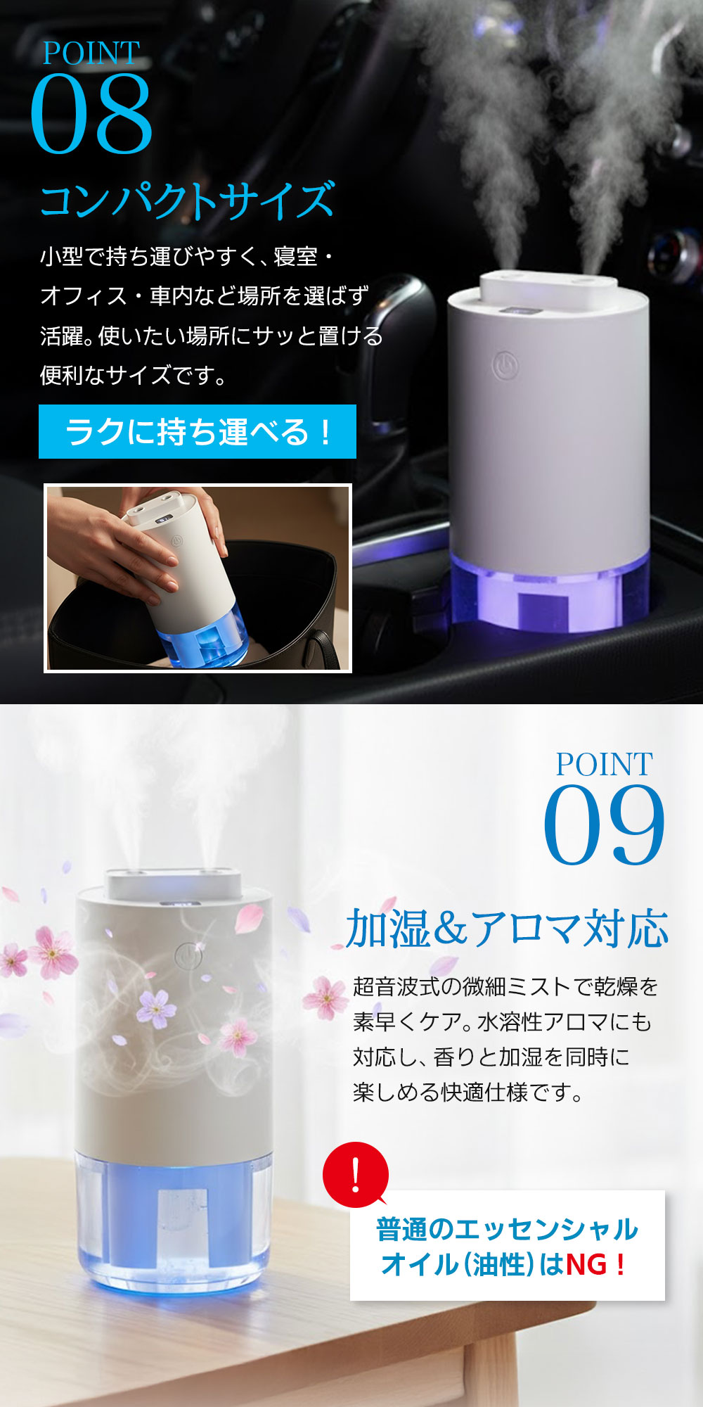 小型で持ち運びやすく、寝室・車内・オフィス・キッチン・育児部屋など場所を選ばず活躍。使いたい場所にサッと置ける便利なサイズ。