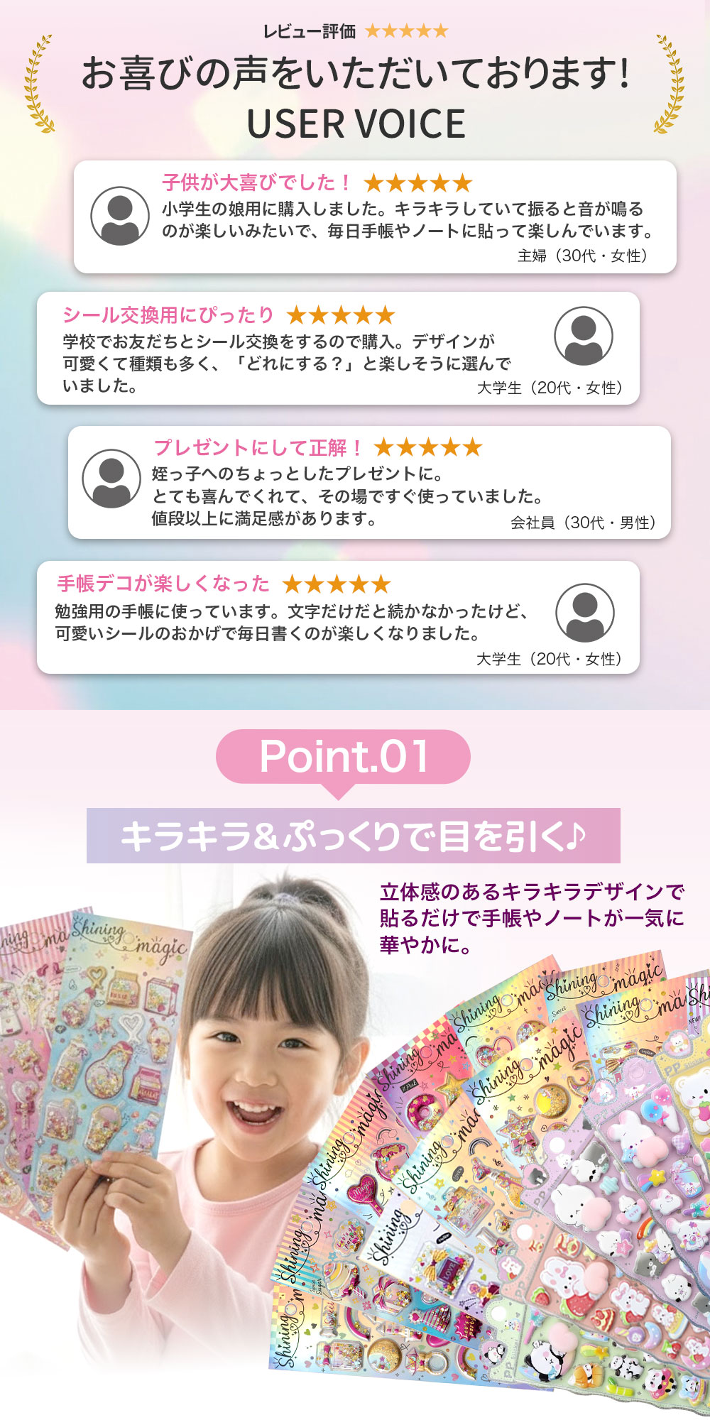 | かわいいデザインなので、誕生日・入学祝い・ちょっとしたご褒美ギフトにも最適。お友だち同士のシール交換にもおすすめです。 |