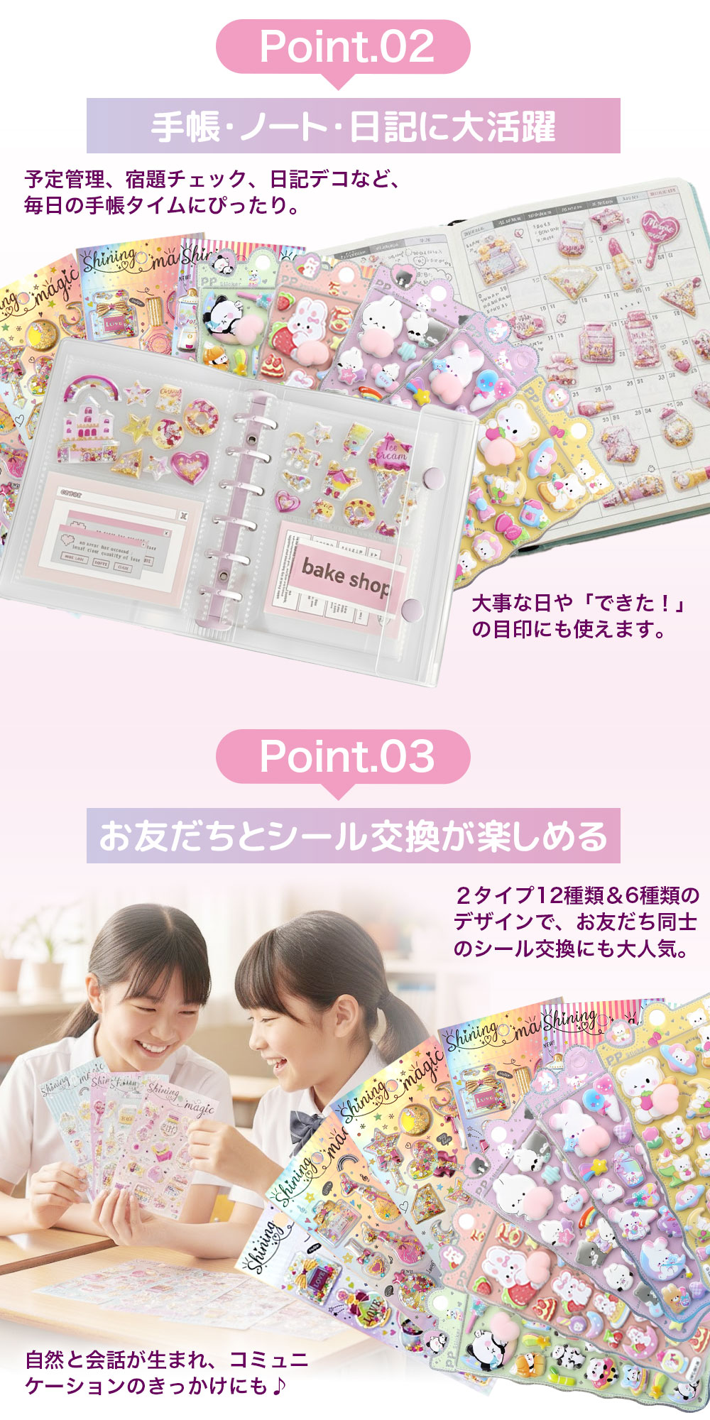 | 立体感のあるぷっくり加工とキラキラ輝くデザインで、手帳やノートが一気に華やかに。予定や大事な日がひと目で分かりやすくなります。 |