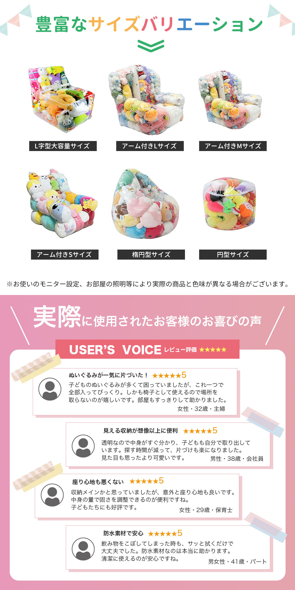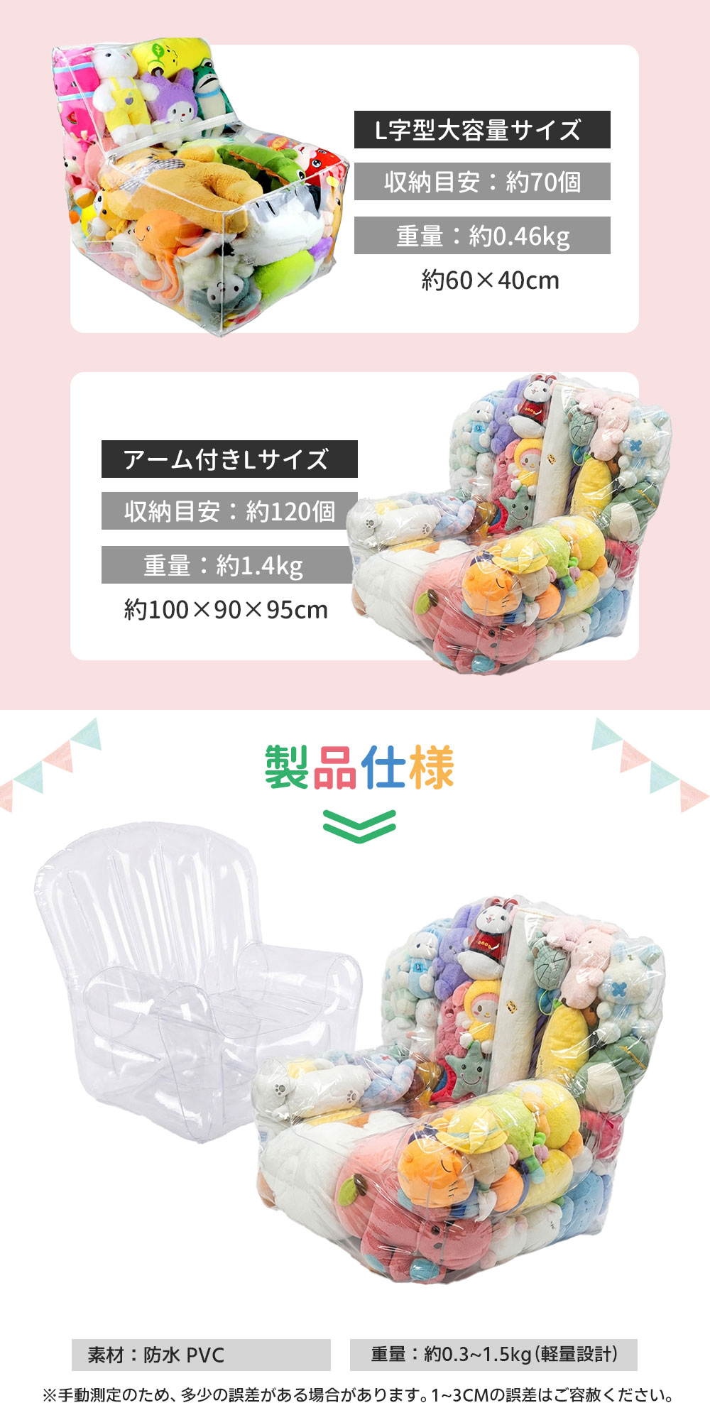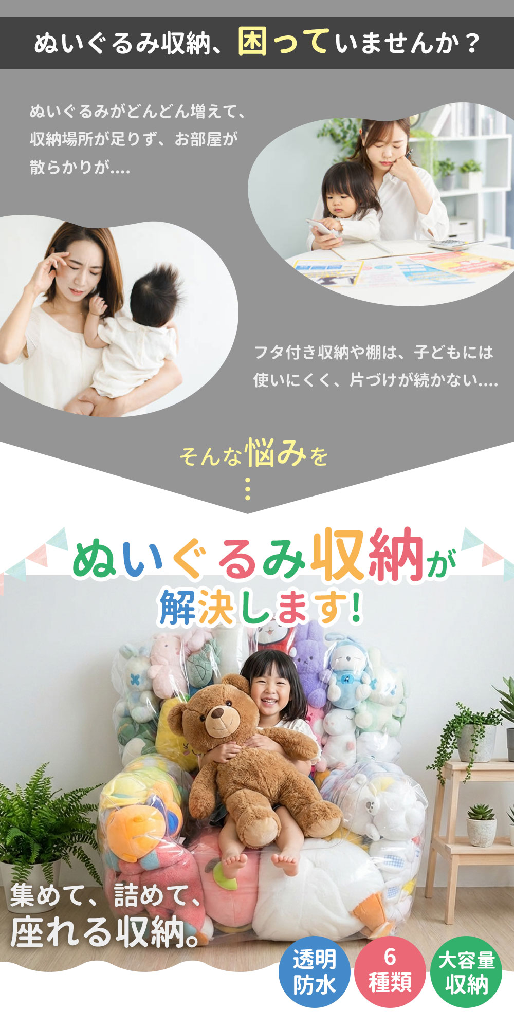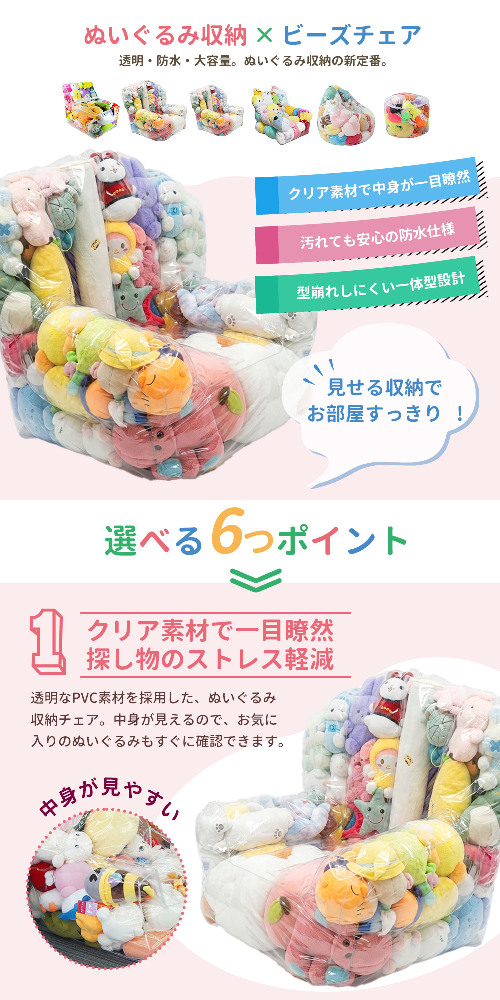 透明PVC素材を採用し、中身が一目で分かるぬいぐるみ収納。