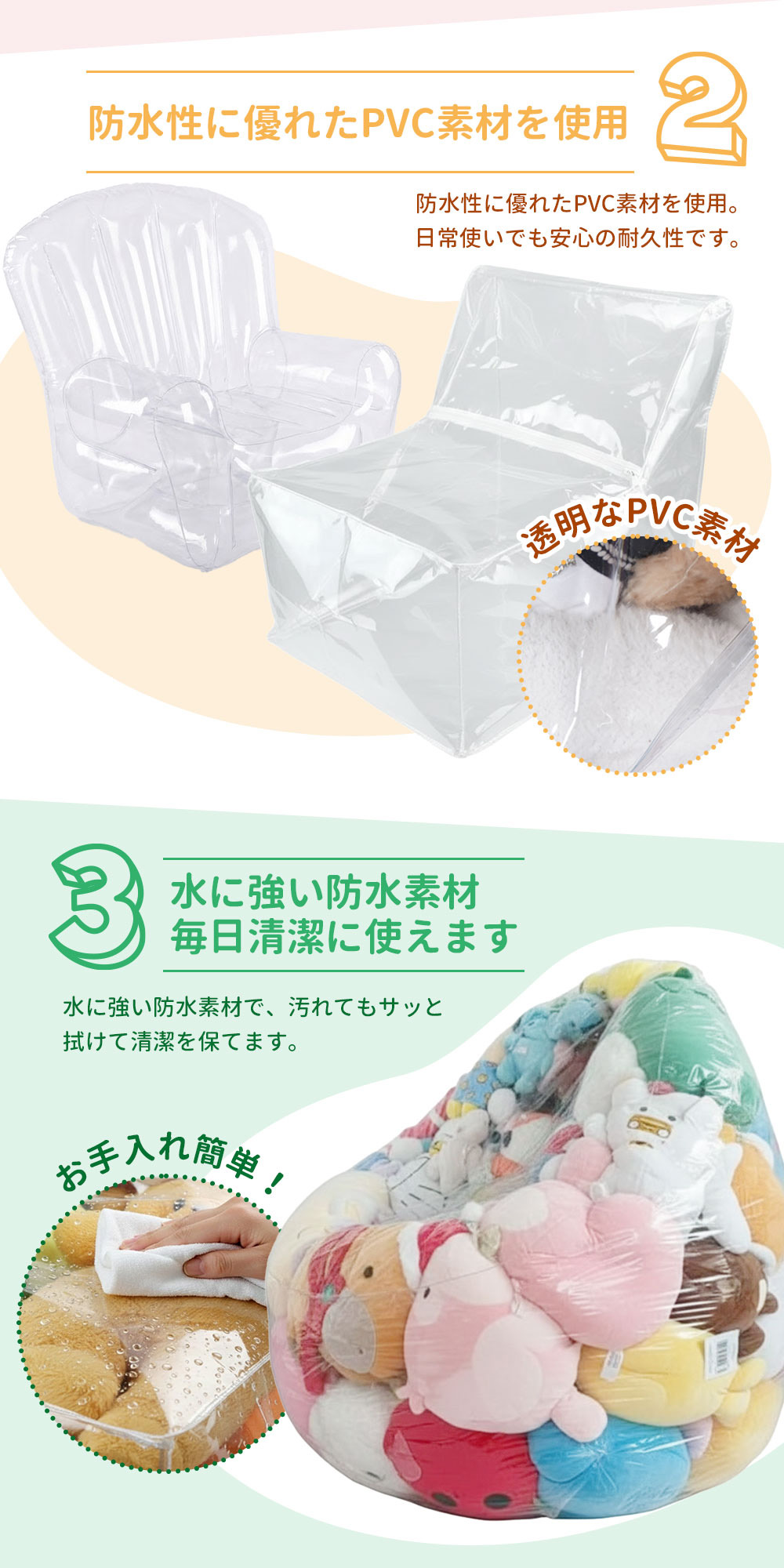 【ポイント3】防水PVC素材でお手入れ簡単