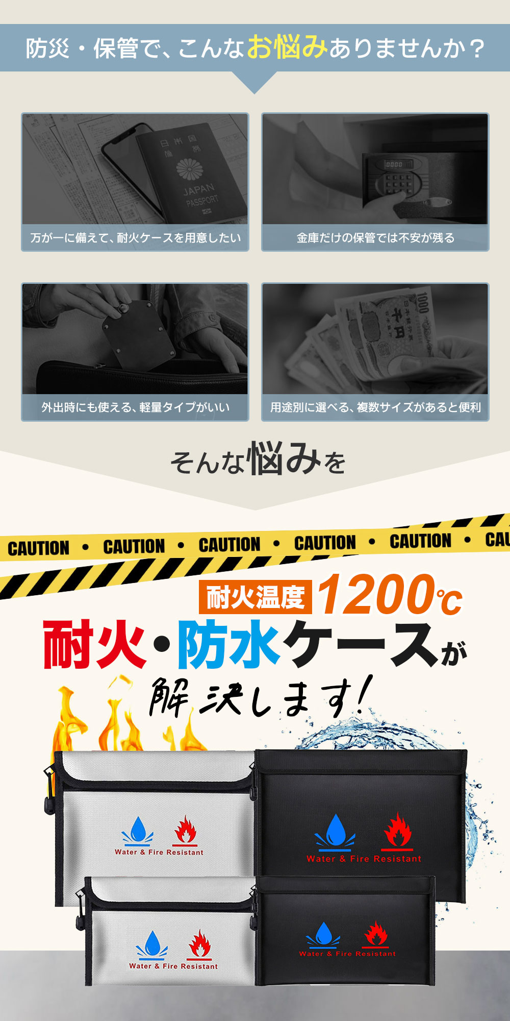 家庭用防災から個人用まで、用途別に選べる耐火防水ケースです。