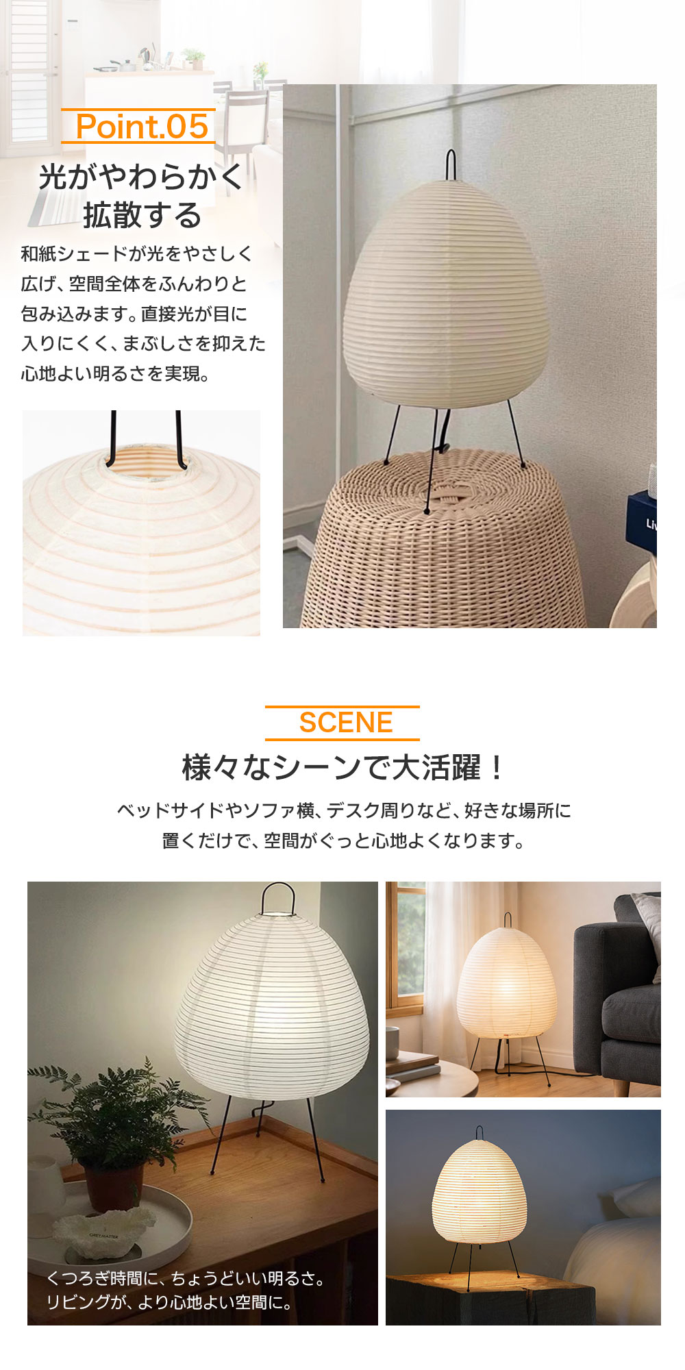 和紙シェードが光をやわらかく拡散し、まぶしさを抑えた心地よい明るさに。