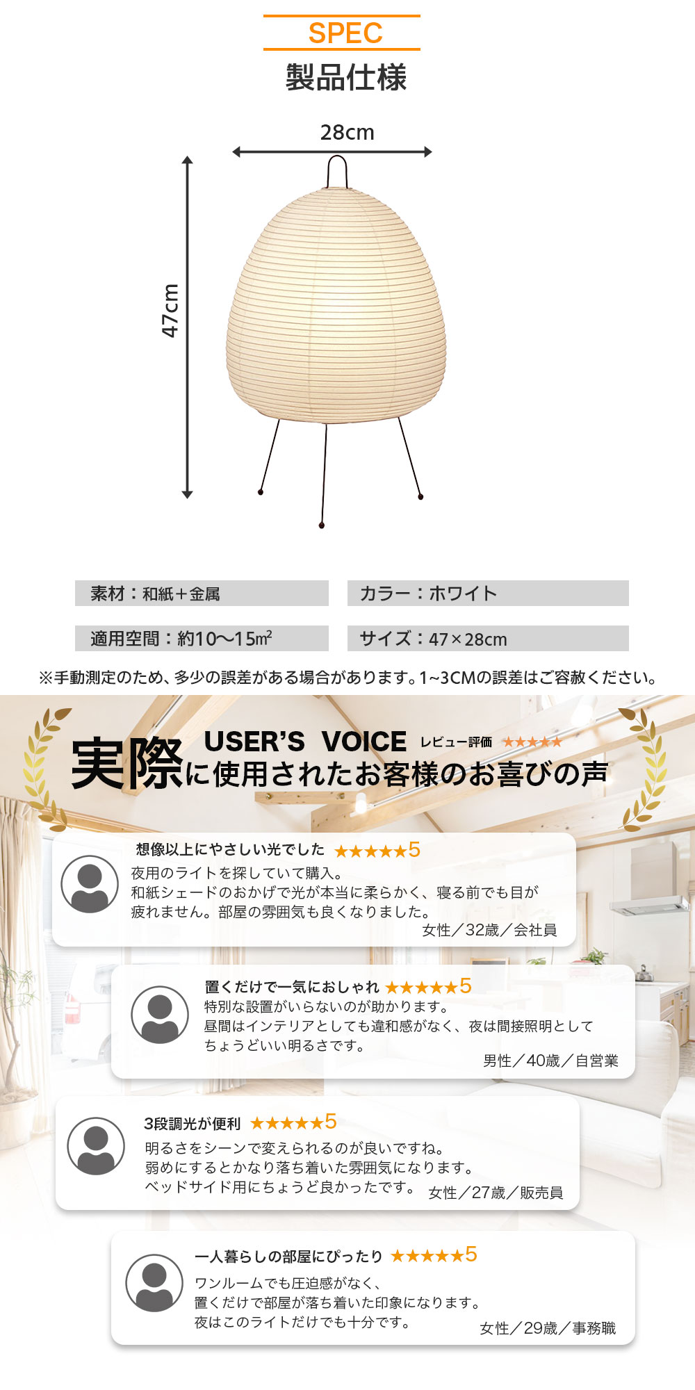 約47×28cmの程よいサイズ感で、ベッドサイドライトや補助照明に最適。