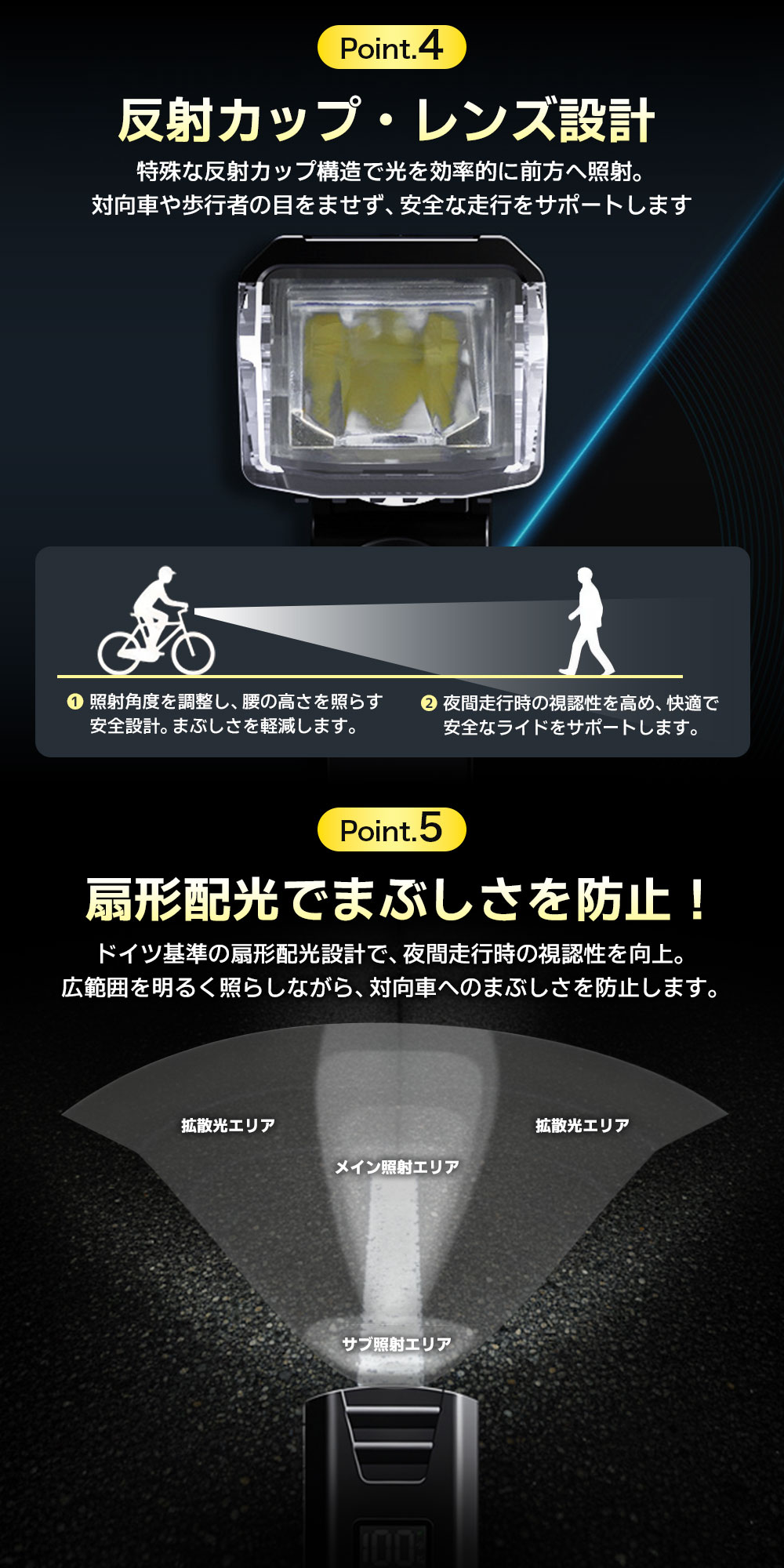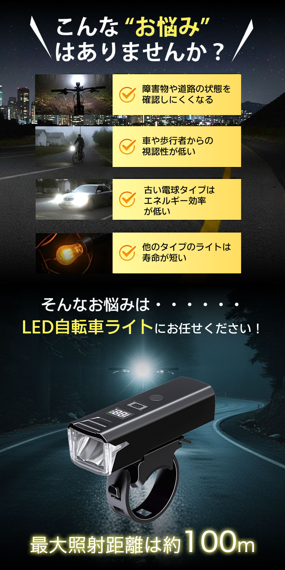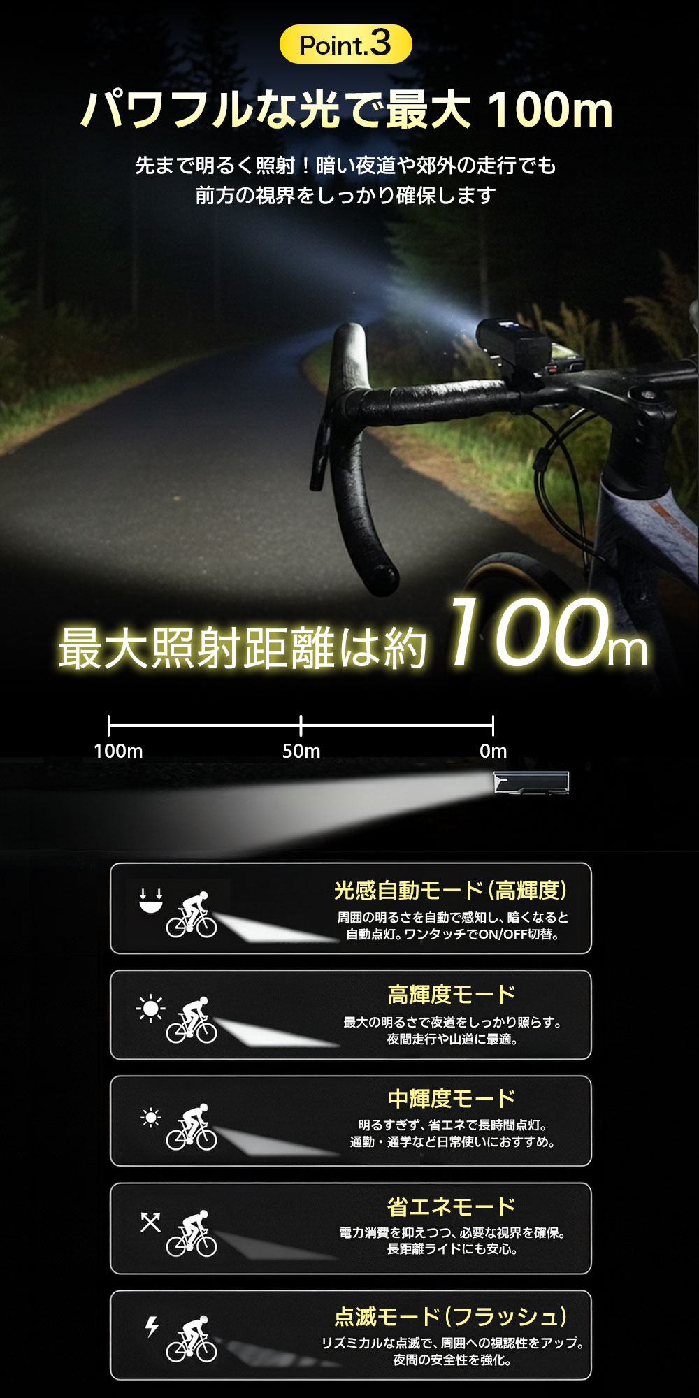 | 【最大照射距離100mのパワフル照明】 | 強力なLEDチップ搭載で、最大約100m先までしっかり照射。暗い夜道や郊外走行でも広範囲を明るく照らします。 |