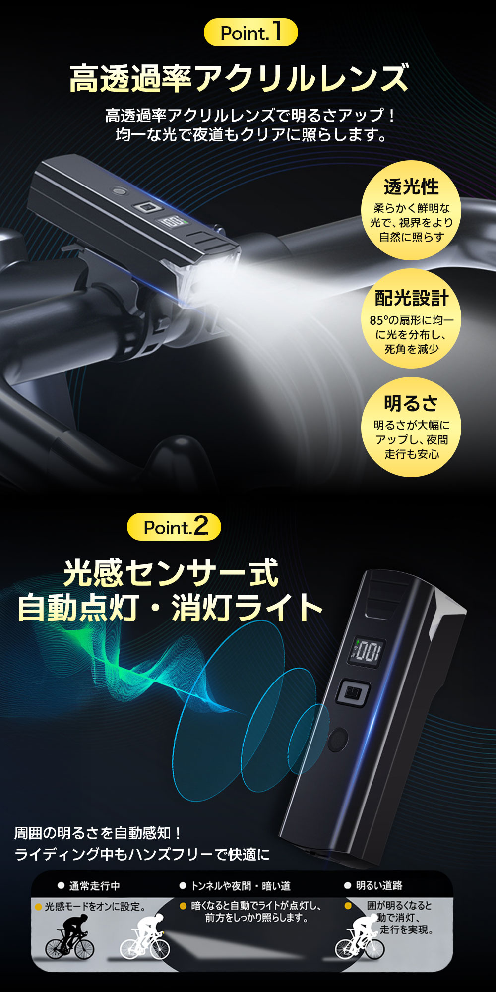 | 【光感センサーで自動点灯・消灯】 | 周囲の明るさを感知して自動で点灯・消灯。手動操作不要で、トンネルや夜間走行でもハンズフリーで快適に使用できます。 |