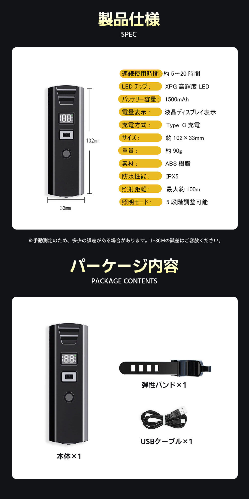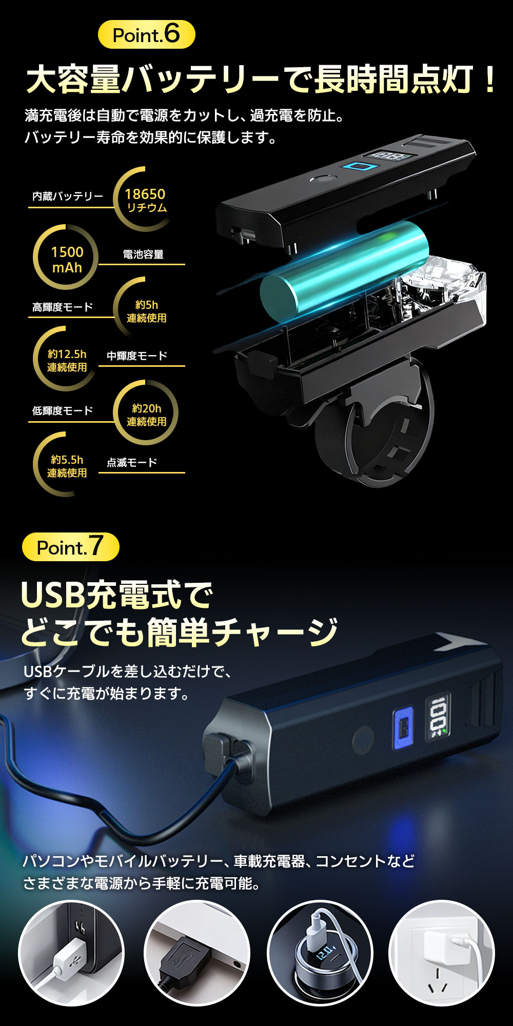 | 【大容量バッテリー&USB充電式】 | 1500mAhリチウムバッテリー内蔵で長時間点灯可能。USB Type-C充電に対応し、PC・モバイルバッテリーなどから簡単充電できます。 |