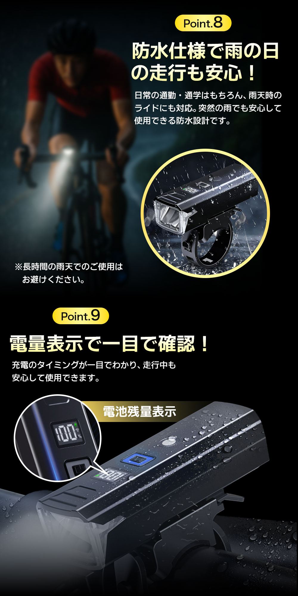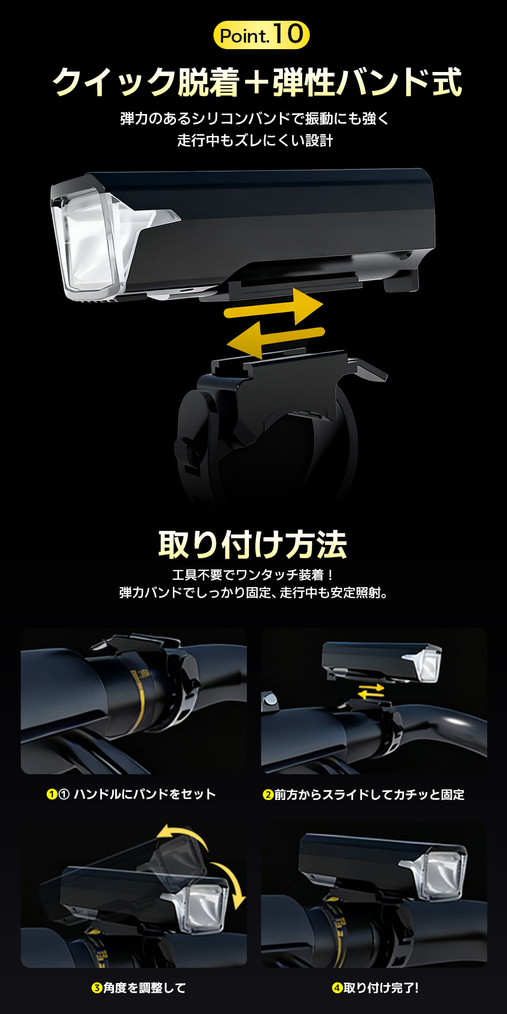 | 【IPX5防水&クイック脱着設計】 | IPX5防水仕様で雨の日の走行も安心。シリコン製バンドでワンタッチ装着でき、走行中もズレにくく安定照射します。 |