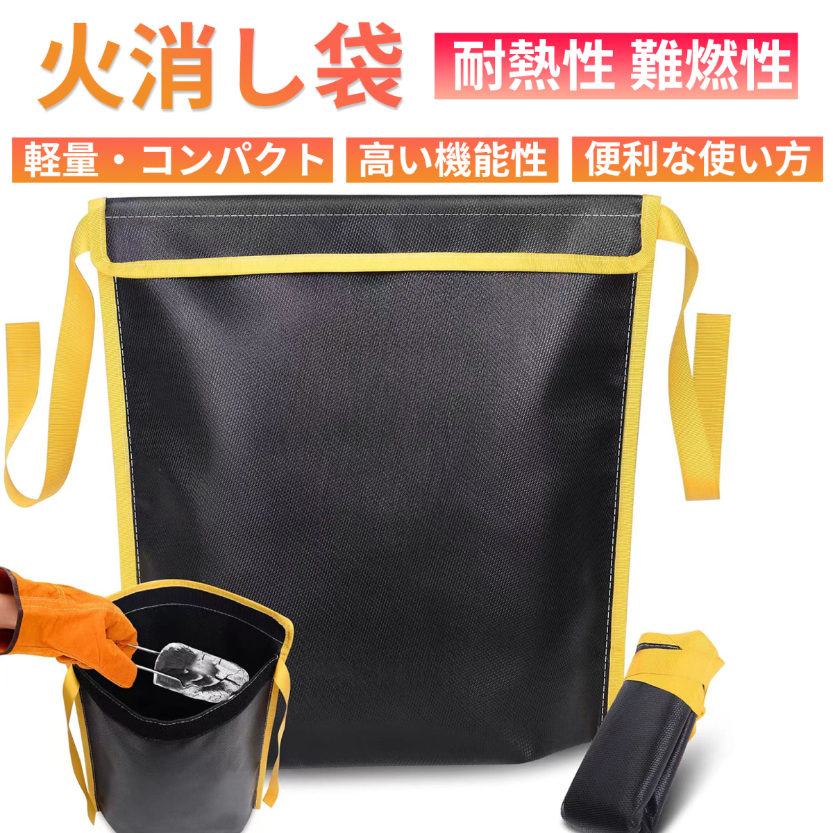 【高い機能性】耐熱ガラスクロスに両面シリコーンコーティングを施してあり、難燃アラミド糸で縫製されています。これによって耐熱性、耐候性、不燃性、撥水性をもち、完全に消火できていない灰や炭を入れて、口を折り曲げることで酸素を完全に遮断し、完全消火へもっていくことができます。