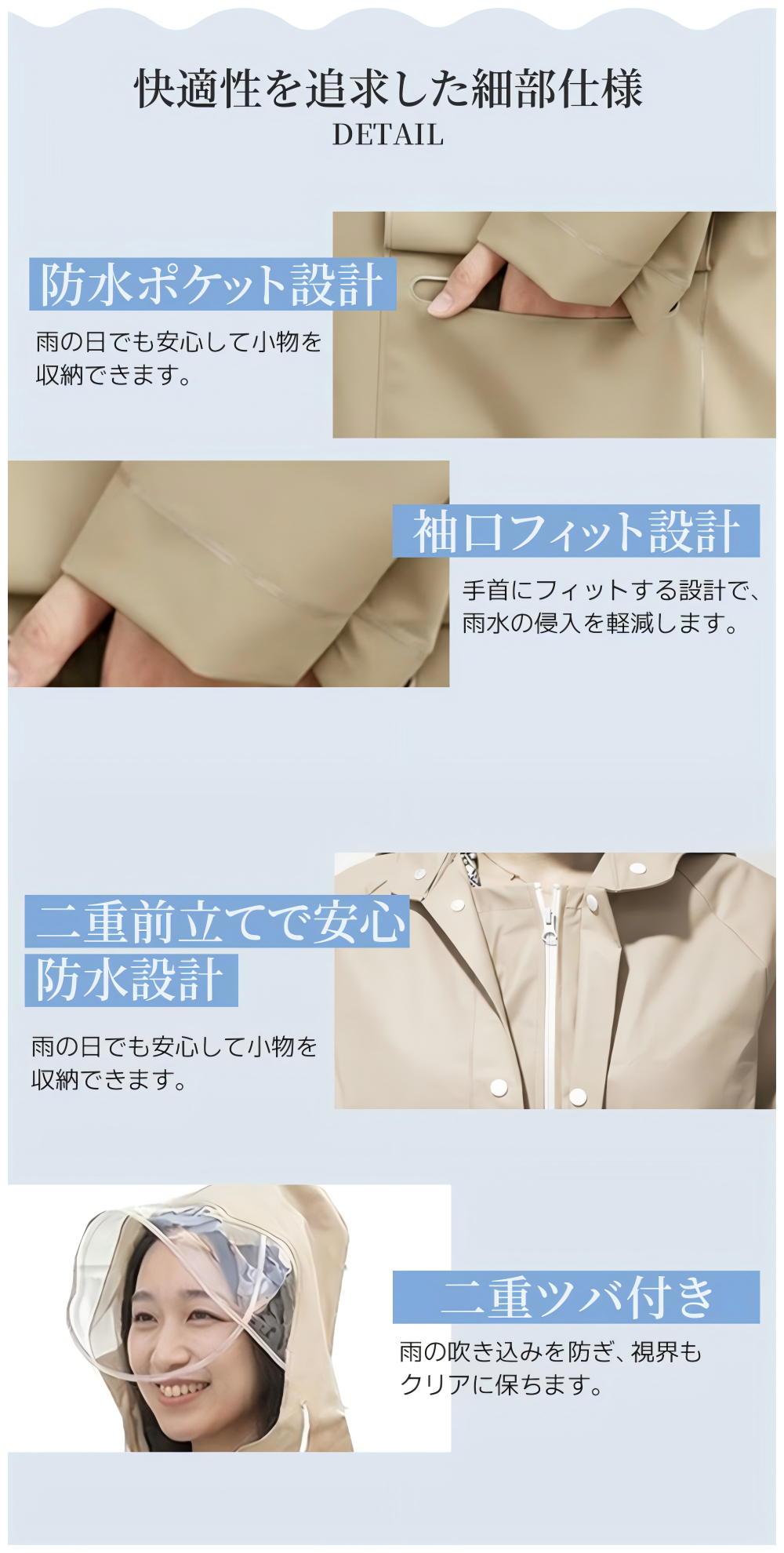 【ポイント4】高機能EVA素材で耐水圧2500mmの防水性能軽量で丈夫なEVA素材を採用し、しっかり雨を弾く防水レインコート。長時間の雨でも安心して使用できます。