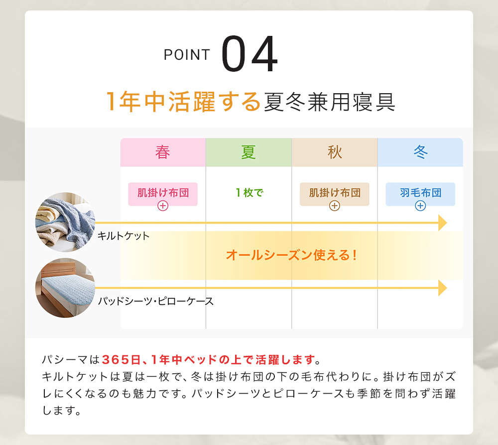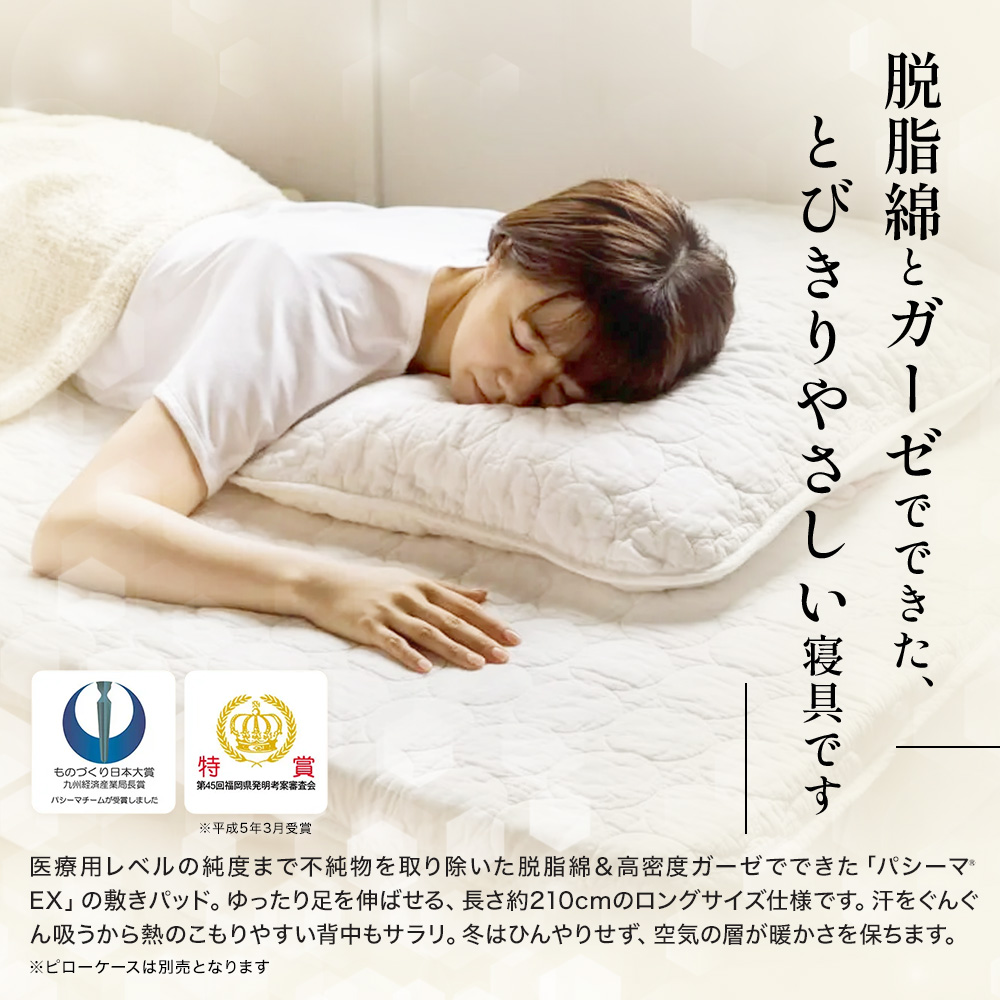 パシーマの気持ちよさを存分に実感できる敷きパッドシーツ代わりにお使いのマットレスや敷布団につけるだけでふわふわの寝心地に。汗をぐんぐん吸うから熱のこもりやすい背中もサラリ。冬はひんやりせず、空気の層が暖かさを保ちます。