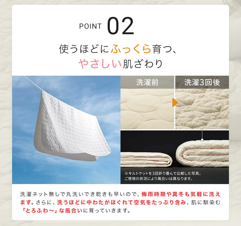 洗濯ネット無しで丸洗いでき乾きも早いので、梅雨時期や真冬も気軽に洗えます。洗うほどに中わたがほぐれて空気をたっぷり含み、肌に馴染む「とろふわ〜」な風合いに育っていきます。