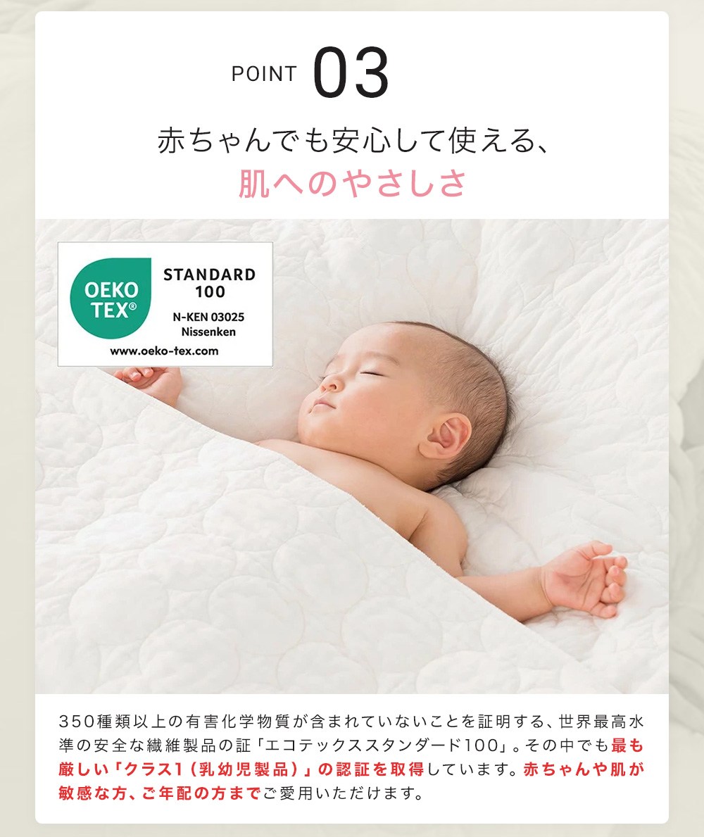 350種類以上の有害化学物質が含まれていないことを証明する、世界最高水準の安全な繊維製品の証「エコテックススタンダード100」。その中でも最も厳しい「クラス1(乳幼児製品)」の認証を取得しています。赤ちゃんや肌が敏感な方、ご年配の方までご愛用いただけます。