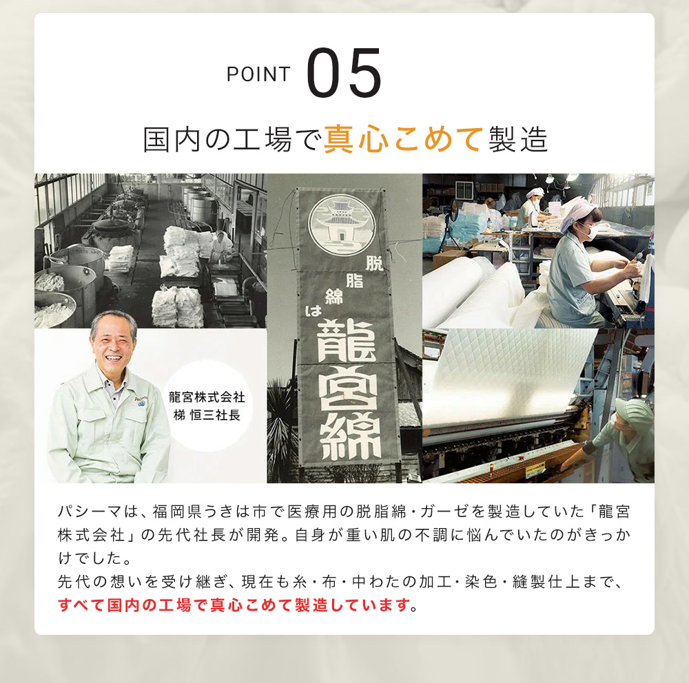 パシーマは、福岡県うきは市で医療用の脱脂綿・ガーゼを製造していた「龍宮株式会社」の先代社長が開発。自身が重い肌の不調に悩んでいたのがきっかけでした。先代の想いを受け継ぎ、現在も糸・布・中わたの加工・染色・縫製仕上まで、すべて国内の工場で真心こめて製造しています。
