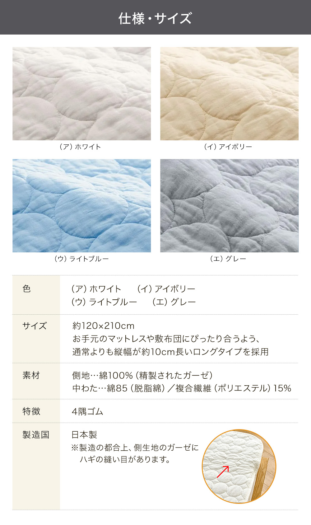 ※製造の都合上、側生地のガーゼにハギの縫い目があります。