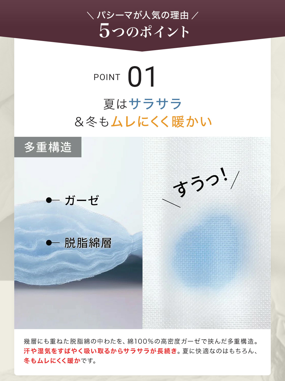 幾層にも重ねた脱脂綿の中わたを、綿100%の高密度ガーゼで挟んだ多重構造。汗や湿気をすばやく吸い取るからサラサラが長続き。夏に快適なのはもちろん、冬もムレずに暖かです。