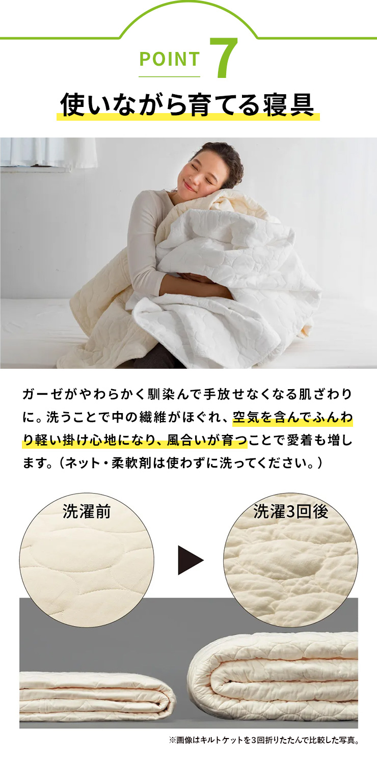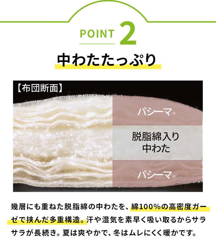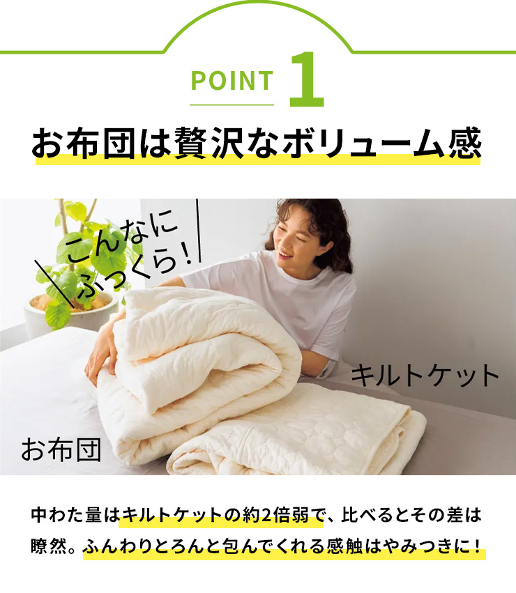 中わた量はキルトケットの約2倍弱で、比べるとその差は瞭然。ふんわりとろんと包んでくれる感触はやみつきに!幾層にも重ねた脱脂綿の中わたを、綿100%の高密度ガーゼで挟んだ多重構造。汗や湿気を素早く吸い取るからサラサラが長続き。夏は爽やかで、冬はムレにくく暖かです。