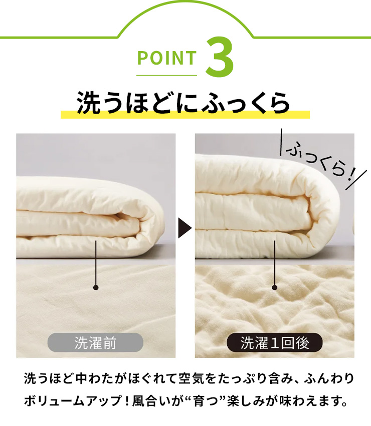 洗うほどにふっくら洗うほど中わたがほぐれて空気をたっぷり含み、ふんわりボリュームアップ!風合いが“育つ”楽しみが味わえます。