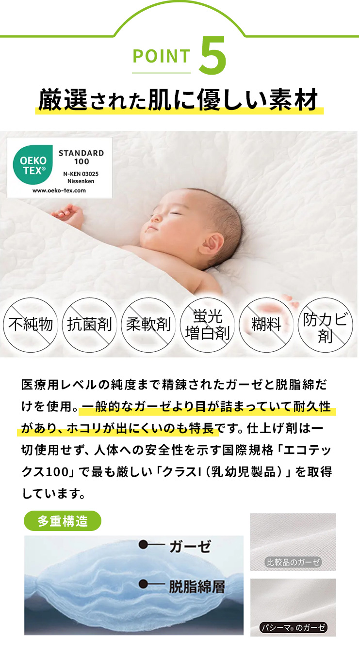 医療用レベルの純度まで精錬されたガーゼと脱脂綿だけを使用。一般的なガーゼより目が詰まっていて耐久性があり、ホコリが出にくいのも特長です。仕上げ剤は一切使用せず、人体への安全性を示す国際規格「エコテックス100」で最も厳しい「クラスI(乳幼児製品)」を取得しています。