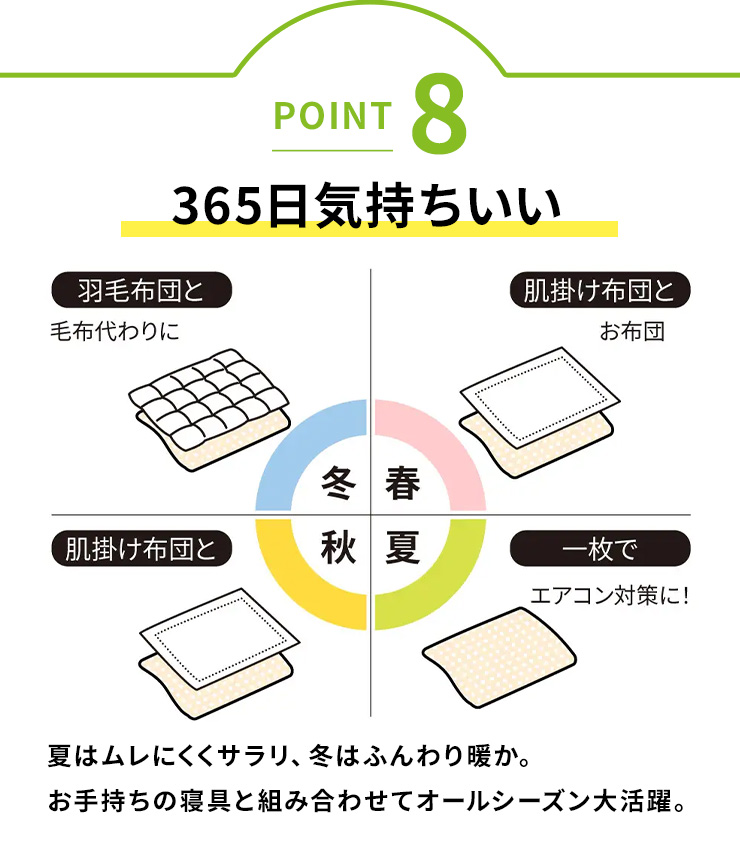 365日気持ちいい夏はムレにくくサラリ、冬はふんわり暖か。お手持ちの寝具と組み合わせてオールシーズン大活躍。