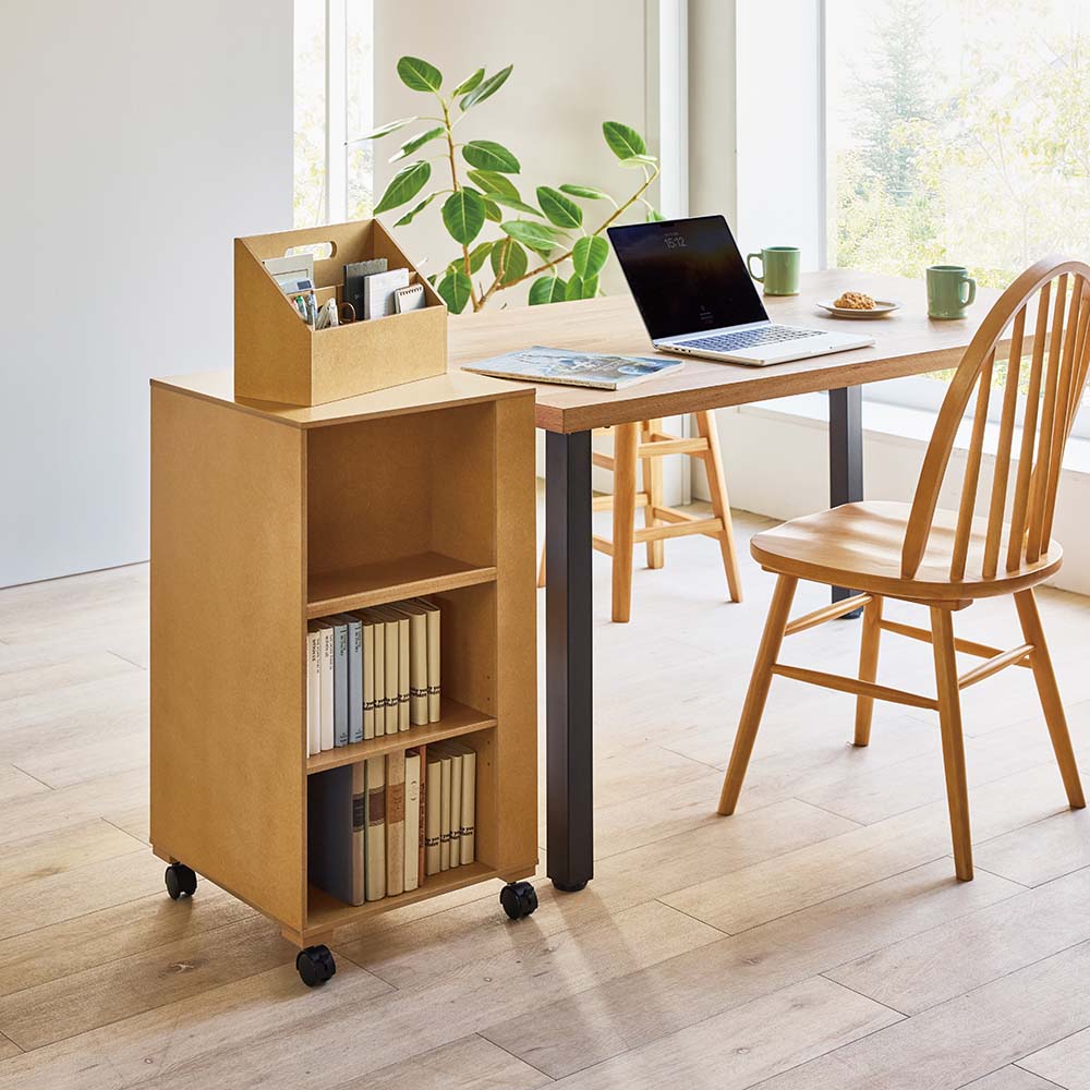 書籍やファイルはオープン棚に、背面はディスプレイ棚として側面のオープン棚には単行本や参考書、背面の縦型収納は雑誌や推し活グッズなどお気に入りのアイテムのディスプレイスペースとしてもおすすめです。