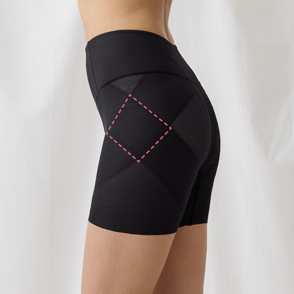 お腹もお尻もすっぽり包む快適なはき心地で、歩行時にぐらつきやすい股関節まわりの負担を軽減。お悩みの多い骨盤底筋も意識でき、アウターにもひびきにくいのでお出かけにも着用できます。