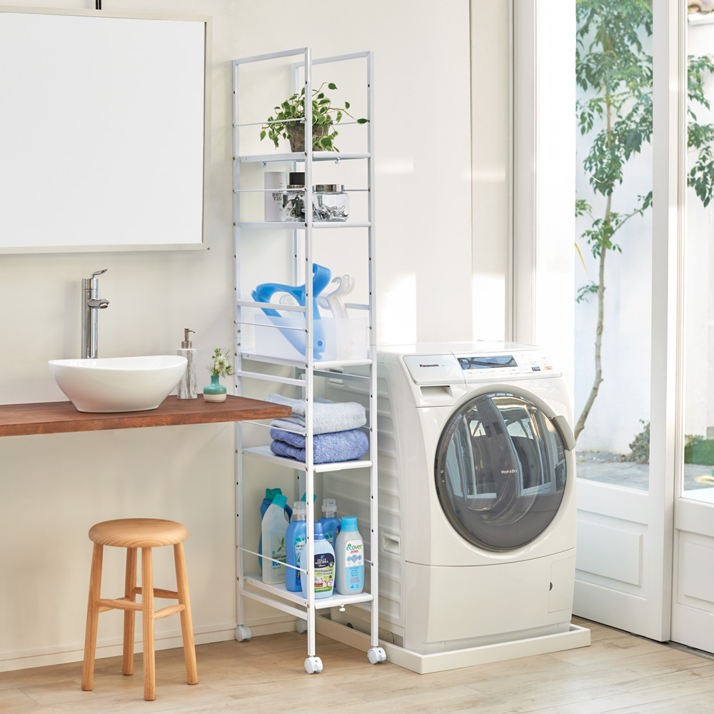 ホワイトの収納ラックでサニタリーを清潔な空間に◆白の隙間ラックが、洗面所を清潔感のあるスッキリとした印象に変身させます。
