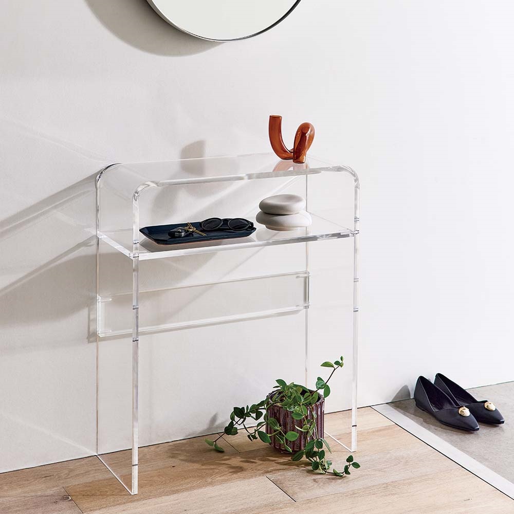 透明な輝きが美しい、おしゃれなアクリルコンソールテーブルの棚付き■たっぷり15mmの厚みのあるアクリルを使用して作った、シンプルなコンソールテーブル。