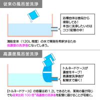3枚目の画像説明文:従来品とはココが違う!配管の奥へ高濃度薬剤を届ける独自設計※自社従来品の風呂釜洗浄剤は追い焚きできる水量が120L〜150L必要である為