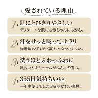 夏はサラリ、冬はふんわり暖か、365日オールシーズン活躍ガーゼと脱脂綿の組み合わせは、汗を素早く吸って発散する吸湿・速乾性に優れ、夏もムレにくくさらりと快適。冬は空気をふんわり含んで暖かみをキープします。季節ごとに入れ替える必要がなく、一年中このまま使い続けられます。