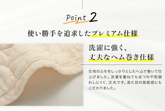 医療用レベルの精製ガーゼと脱脂綿の素材、赤ちゃんにも使える安心感側地には医療用レベルまで精製されたガーゼ、中わたには脱脂綿を使用。一般的なガーゼより目が詰まっていてホコリが出にくく、耐久性もあります。仕上げ剤は一切使用せず、国際規格「エコテックス100」の最高基準「クラスI(乳幼児製品)」を取得。肌が敏感な方も安心してお使いいただけます。