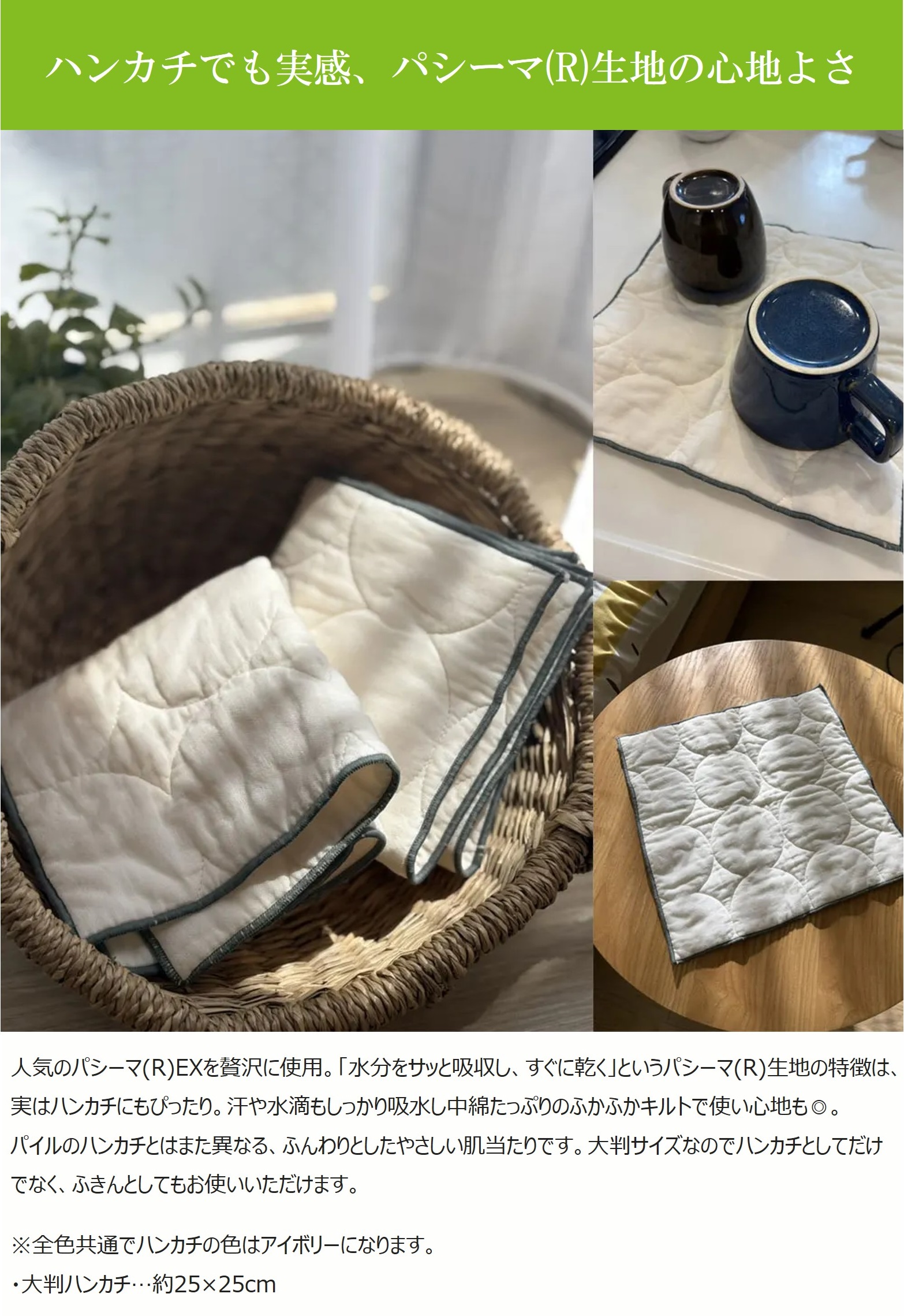 ハンカチでも実感、パシーマ(R)生地の心地よさ人気のパシーマ(R)EXを贅沢に使用。「水分をサッと吸収し、すぐに乾く」というパシーマ(R)生地の特徴は、実はハンカチにもぴったり。汗や水滴もしっかり吸水し中綿たっぷりのふかふかキルトで使い心地も◎。