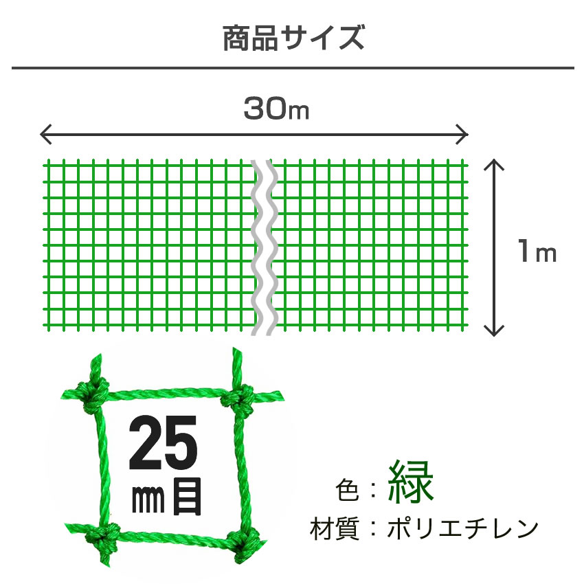 ●スポーツ・防球用、簡易フェンス、鳥よけ、防獣など、様々な用途へご利用いただける約25mm目の丈夫な有結ネット。