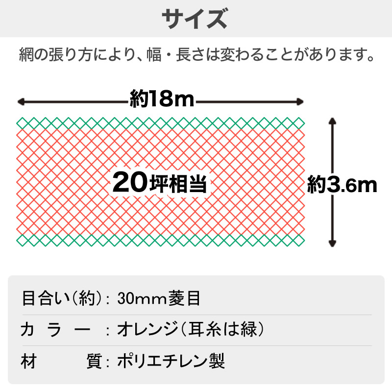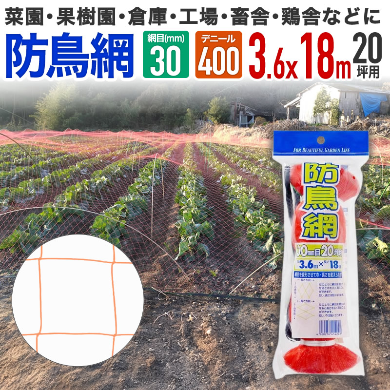 公式 防鳥網 オレンジ 30mm目 20坪 3.6mx18m 400D 農園芸用 やや目の細かいタイプ 車庫、倉庫、工場にも 経済的で手軽な防鳥対策に 1年程度の短期利用向け