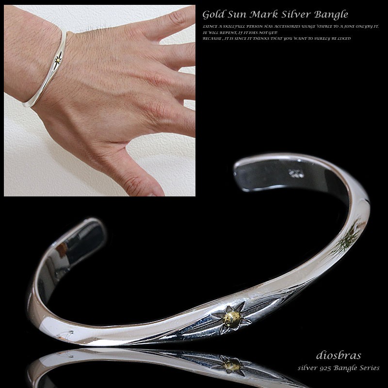 センターにゴールドサンマークをセットしたバングル。 使い込むほどに味のあるエイジング(経年変化)を見せてくれます。バングルはしっかりとした厚みを付けたスターリングシルバー【silver925】を使用しております。