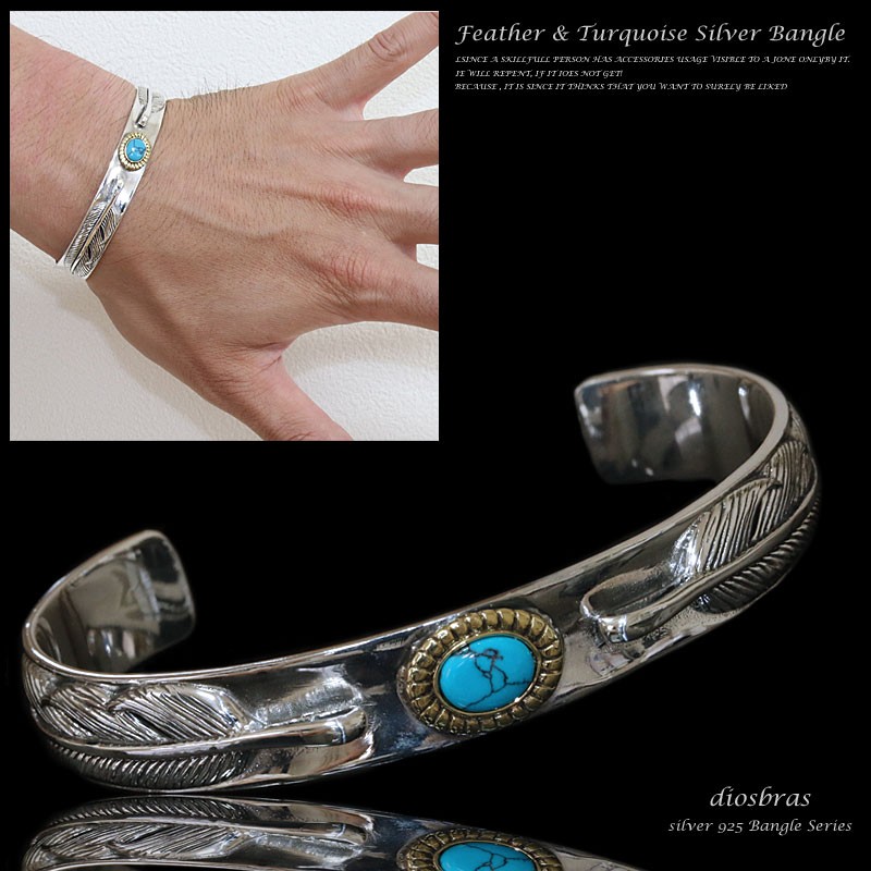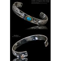 立体的なフェザーのデザインワークとシルバーならではの切れ味鋭いハードさを演出するターコイズ&フェザーバングルです。 重量感と質感がさらにアップしておりすばらしいエイジング(経年変化)を見せてくれます。バングルはしっかりとした厚みを付けたスターリングシルバー【silver925】を使用しております。