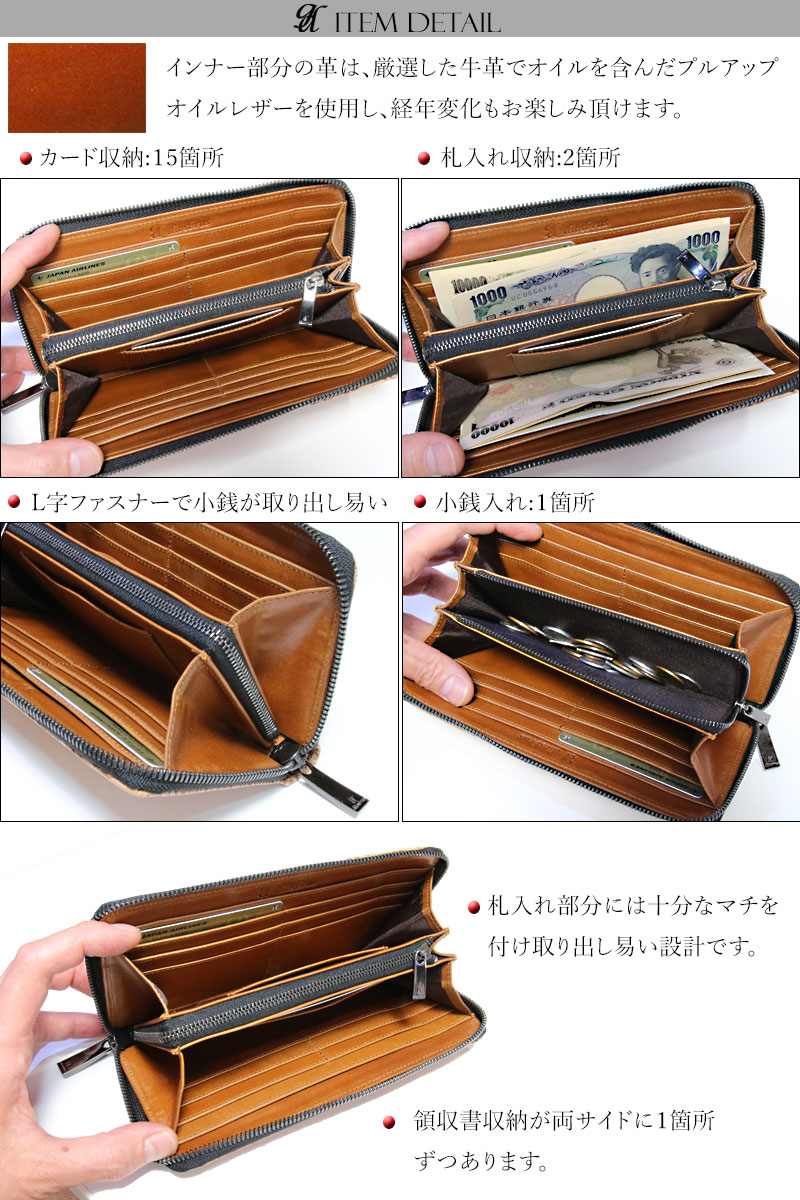 コインケースにはL型ファスナー を採用、通常のストレートタイプとは違い、高度な縫製技術を必要とする大変高度な技術です。