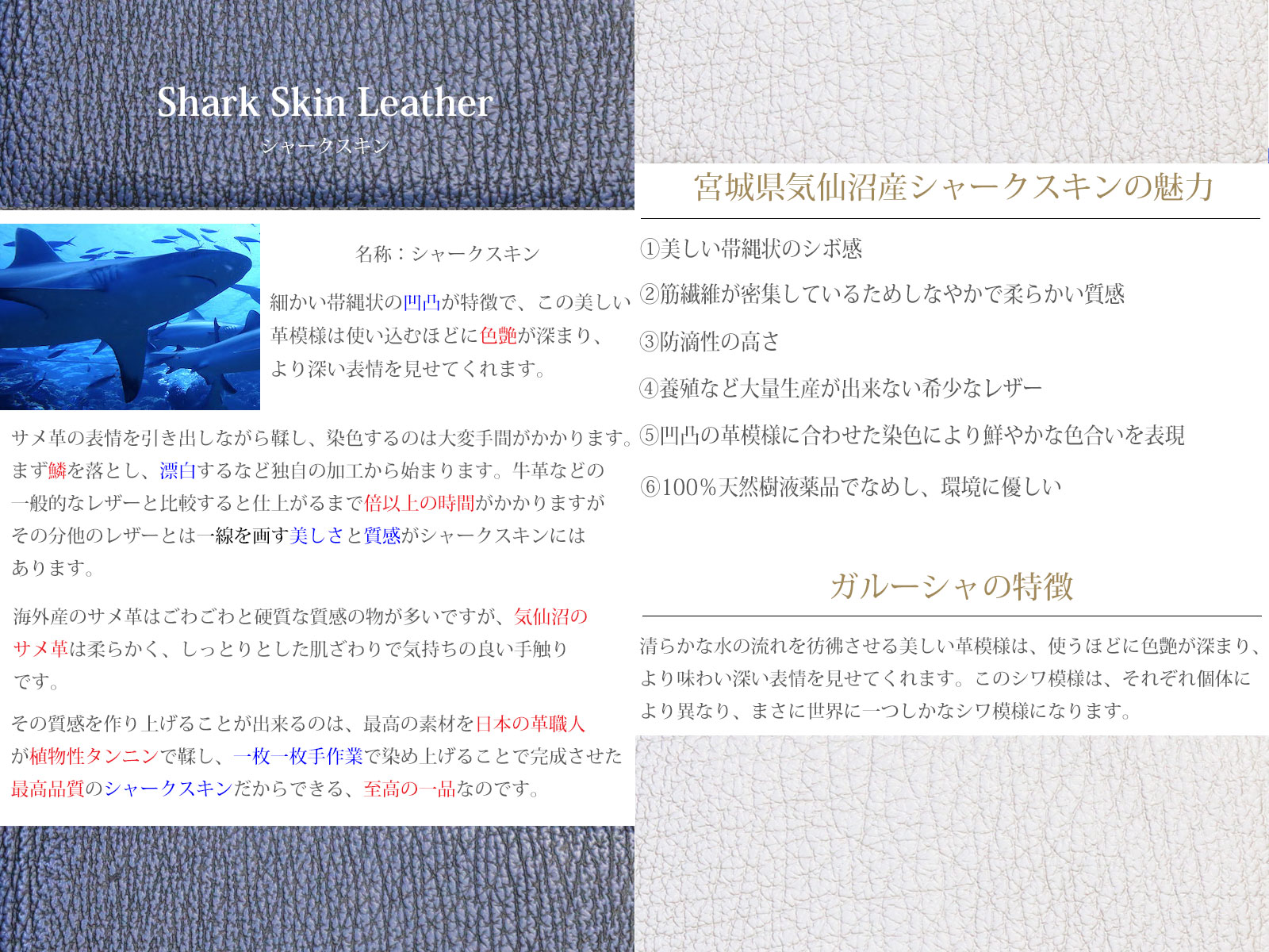 シャークスキンは、なめし加工、染色加工が難しく、革として仕上げるのが大変で、希少な革になっております。 表面は耐久性、耐水性にもすぐれ、使い込むほど、艶、光沢がまして行きます。 ガンガン使って頂き、シャークスキン特有の艶、光沢をお楽しみください!!宮城県気仙沼産のシャークスキンでしか出せない質感と柔らかさをご堪能ください。