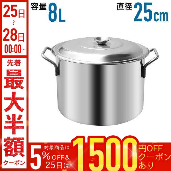 【24cm/容量8L】 ステンレス製寸胴鍋 ◆寸胴鍋とは内径に比べて底が深い、まさしく寸胴の形をしています。◆蒸発面が小さいのでスープの煮出し、麺類の湯で上げなどに最適です。◆飲食店や町内会や学校行事など各種イベントにいかがでしょうか。◆錆に強いステンレス製、煮物全般はこれで作れます。 ◆表面はきれいに鏡面加工されています。【商品詳細】 容量:8L材質:ステンレスサイズ(約):外寸・幅31×直径27×高さ18cm 内寸・直径24.8×深さ17cm重さ(約):1.7kg