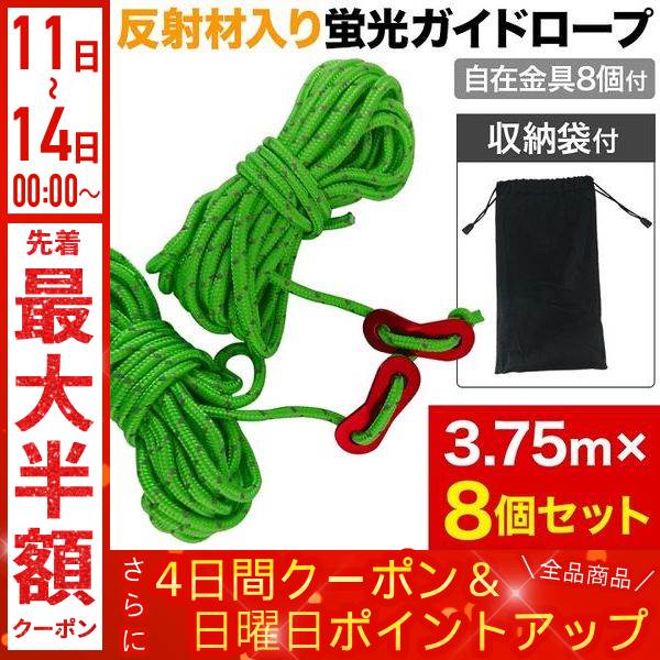 テントロープ 4mm 8本セット 反射 タープロープ 3m70cm ガイドロープ 収納袋付き キャンプロープ 自在金具 調整金具 ガイライン ガイロープ パラロープ 1位