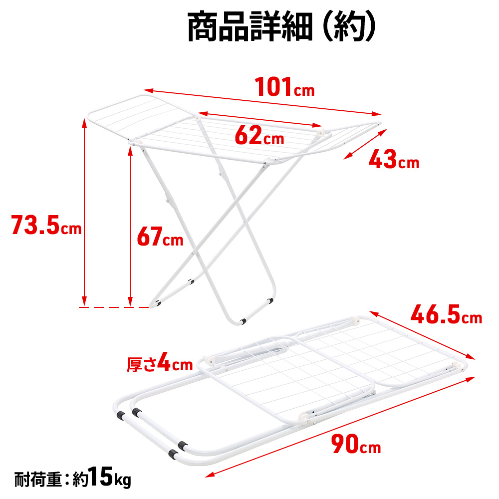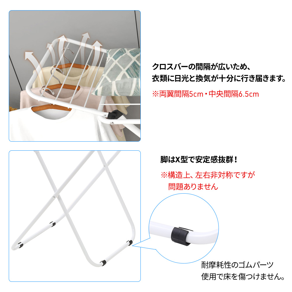 クロスバーの間隔が広いため(両翼間隔5cm・中央間隔6.5cm)、衣類に日光と換気が十分に行き届きます。