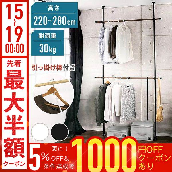 ハンガーラック スリム おしゃれ 頑丈 突っ張りハンガーラック 安い パイプハンガー 2段 子供用 ハンガーシェルフ 白 黒 ブラック ホワイト