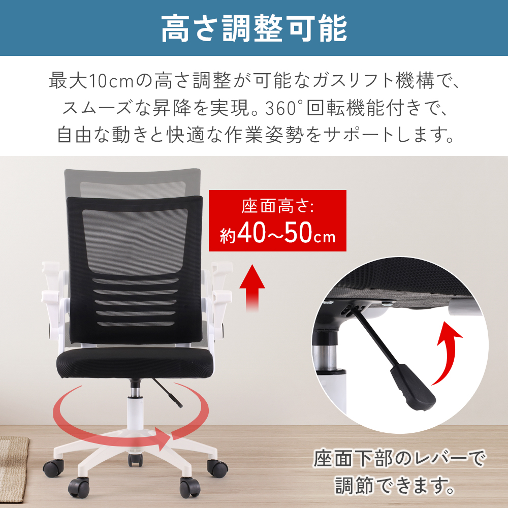 レバー操作で座面の高さを調整できるため、デスクや体型に合わせて快適な高さに調整可能