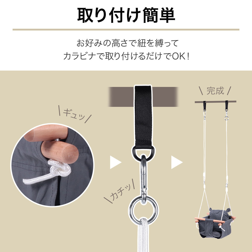 お好みの高さで紐を縛って、カラビナで取り付けるだけでOK!