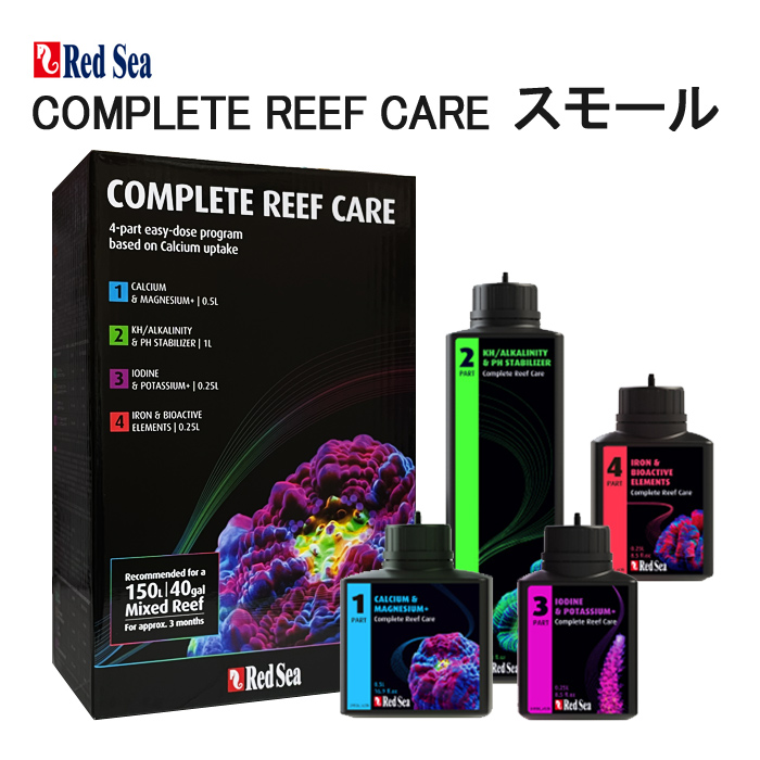 4つの添加剤からなるコンプリートリーフケアは、サンゴ水槽で定期的に守秘される36種類の主要元素、微量元素のすべてを補充することで、サンゴの成長と発色を促進します。