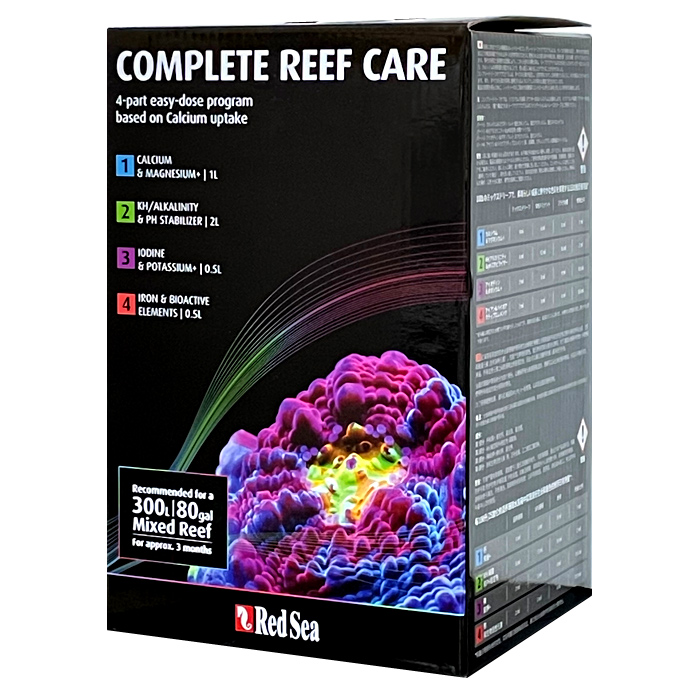 4つの添加剤からなるコンプリートリーフケアは、サンゴ水槽で定期的に守秘される36種類の主要元素、微量元素のすべてを補充することで、サンゴの成長と発色を促進します。