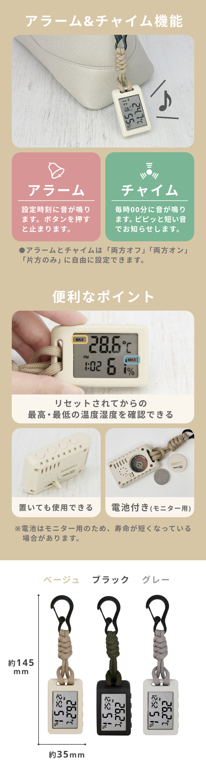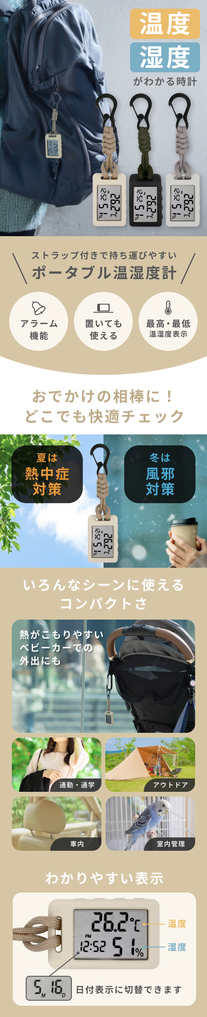 温度計 湿度計 ポータブル 温湿度計 時計付き 熱中症対策 温度 湿度 デジタル 小型 赤ちゃん ベビー アウトドア ストラップ リュック YM095-1BE