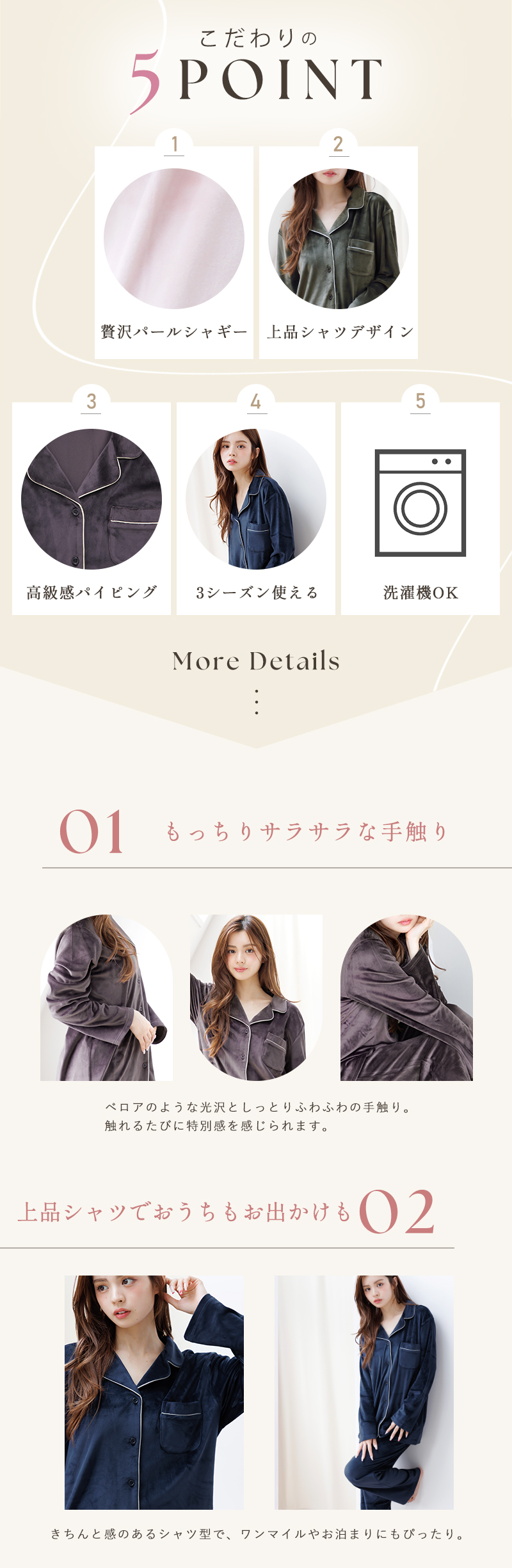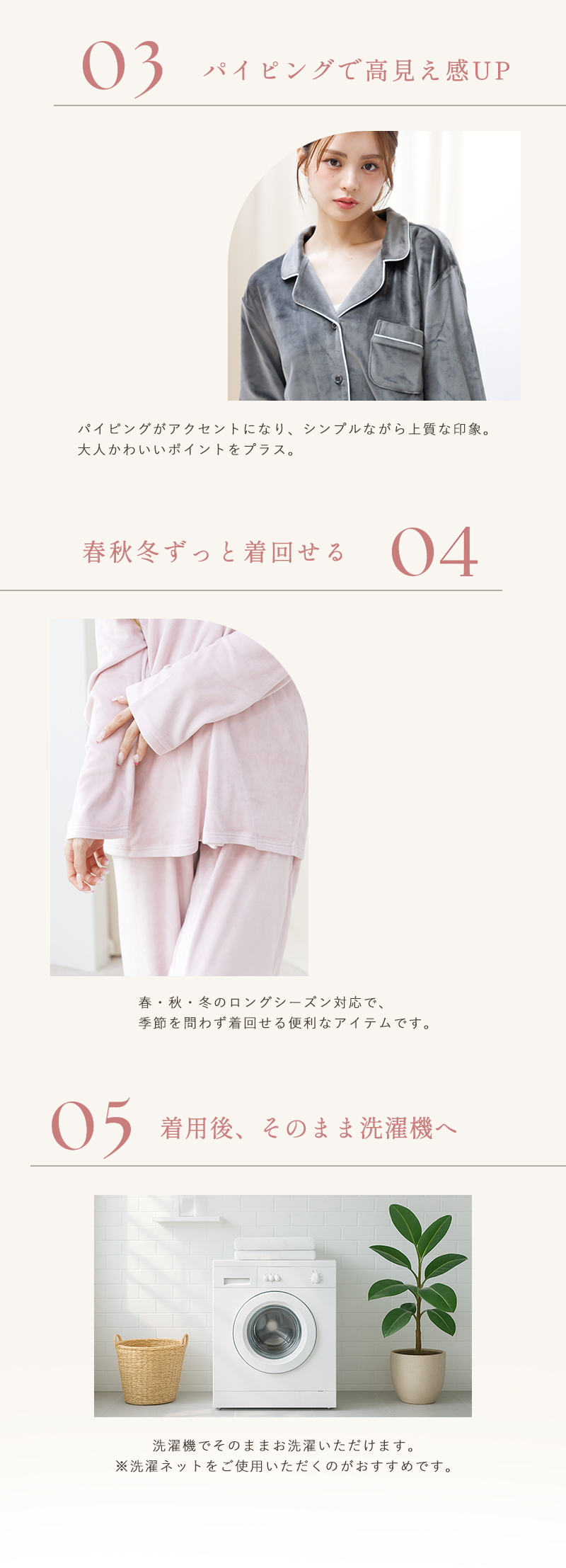 お泊りやルームパーティでも、愛され度高めのルームウェアが登場♪柔らかく、もちっとした素材でムースのようなずっと触りたくなるなめらかな生地感。マットな艶が高級感を演出してくれます♪伸縮性がある生地とボトムはウエストゴム仕様でリラックスできる着心地です。差し色のパイピングがポイントになっていて、シンプルながらお洒落さも◎ウエストゴムで着脱簡単なロングパンツは、足元まであたためてくれます。プレゼントとしてもオススメです♪